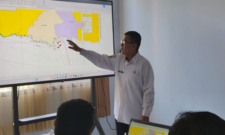 Kepala Bagian Pemerintahan Sekretariat Daerah (Setda) Trenggalek, Teguh Sri Mulyanto menunjukan letak pulau yang diklaim masuk wilayah Kabupaten Tulungagung